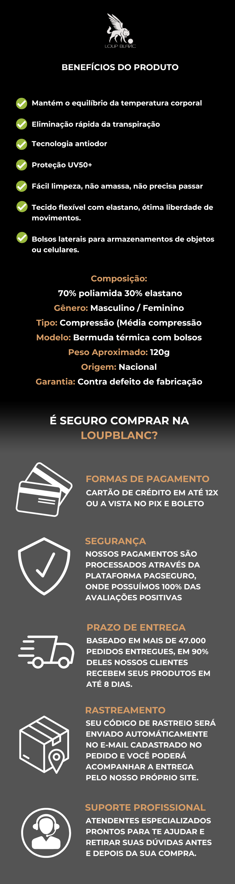 A Bermuda Térmica LOUP BLANC Run Fit é a Bermuda que une todos requisitos para sua melhor performance nas pistas, conforto para corridas de alta intensidade, compressão confortável e leveza, perfeita para correr em qualquer temperatura mantendo o equilíbrio térmico! E tudo com a tradicional qualidade LOUP e um estilo diferenciado em cores preto e detalhes colors ela trás uma beleza única possibilitando combinações perfeitas com diversas de nossos itens como Top Cropped e regatas e camisas térmicas em diversas cores! E mais…